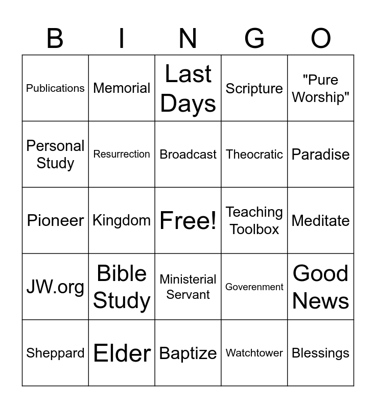 This bingo card has a free space and 29 words: Sheppard, Convention, Kingdom, Ministry, Publications, Last Days, Resurrection, Bible Study, Teaching Toolbox, Elder, Meditate, Blessings, Baptize, Watchtower, Paradise, JW Library, Ministerial Servant, JW.org, "Pure Worship", Pioneer, Goverenment, Publisher, Theocratic, Personal Study, Scripture, Memorial, Good News, Broadcast and Meetings.