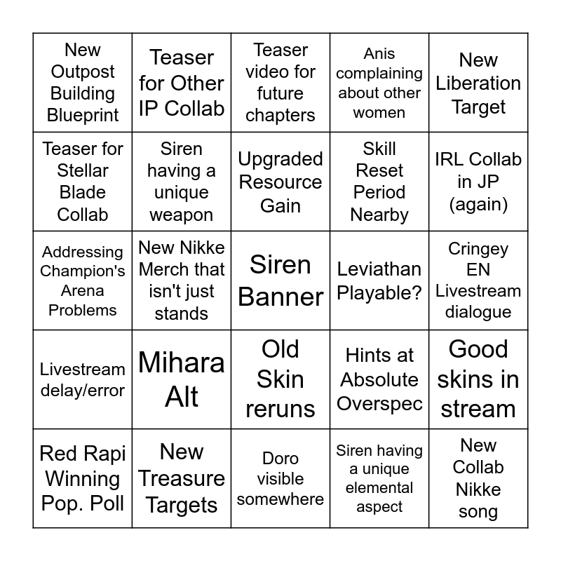 This bingo card has a free space and 24 words: Mihara Alt, New Treasure Targets, Upgraded Resource Gain, Red Rapi Winning Pop. Poll, New Liberation Target, New Outpost Building Blueprint, Teaser for Stellar Blade Collab, Teaser for Other IP Collab, Leviathan Playable?, Old Skin reruns, Skill Reset Period Nearby, Addressing Champion's Arena Problems, Hints at Absolute Overspec, Good skins in stream, Siren having a unique weapon, Siren having a unique elemental aspect, Cringey EN Livestream dialogue, Teaser video for future chapters, IRL Collab in JP (again), New Nikke Merch that isn't just stands, New Collab Nikke song, Livestream delay/error, Anis complaining about other women and Doro visible somewhere.