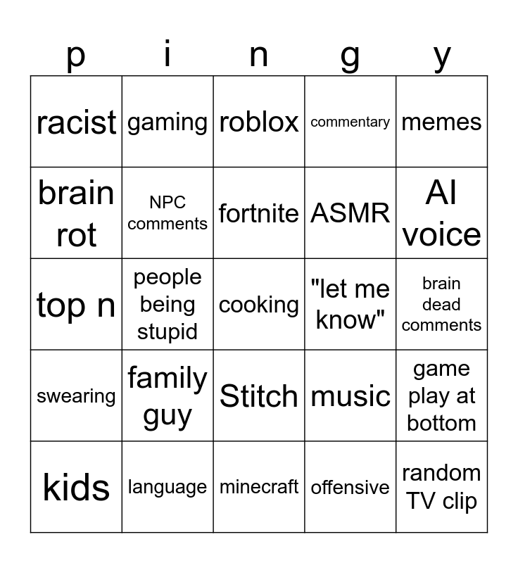 This bingo card has 25 words: swearing, language, cooking, offensive, memes, racist, gaming, roblox, "let me know", game play at bottom, brain rot, NPC comments, minecraft, music, AI voice, kids, people being stupid, fortnite, ASMR, brain dead comments, top n, family guy, Stitch, commentary and random TV clip.