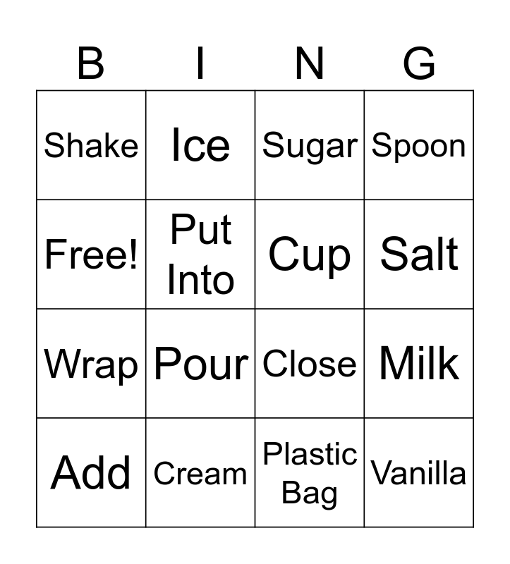 This bingo card has 16 words: Cream, Milk, Sugar, Shake, Wrap, Ice, Close, Plastic Bag, Free!, Put Into, Add, Spoon, Pour, Salt, Cup and Vanilla.