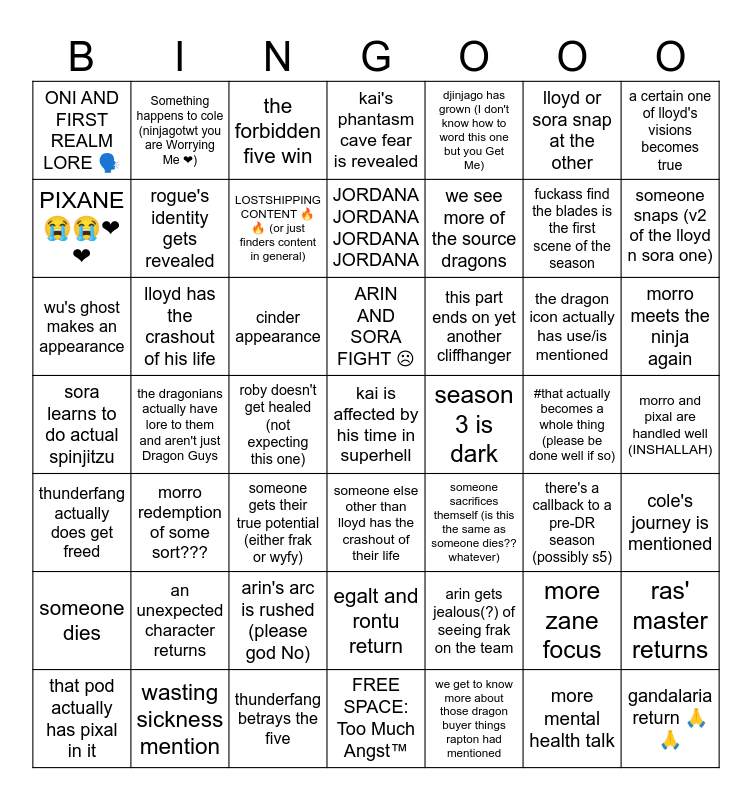 This bingo card has 49 words: someone dies, lloyd has the crashout of his life, arin's arc is rushed (please god No), someone else other than lloyd has the crashout of their life, this part ends on yet another cliffhanger, #that actually becomes a whole thing (please be done well if so), a certain one of lloyd's visions becomes true, that pod actually has pixal in it, rogue's identity gets revealed, roby doesn't get healed (not expecting this one), JORDANA JORDANA JORDANA JORDANA, djinjago has grown (I don't know how to word this one but you Get Me), fuckass find the blades is the first scene of the season, morro meets the ninja again, thunderfang actually does get freed, morro redemption of some sort???, the forbidden five win, ARIN AND SORA FIGHT βΉ, we get to know more about those dragon buyer things rapton had mentioned, lloyd or sora snap at the other, someone snaps (v2 of the lloyd n sora one), PIXANE ππβ€β€, Something happens to cole (ninjagotwt you are Worrying Me β€), LOSTSHIPPING CONTENT π₯π₯ (or just finders content in general), FREE SPACE: Too Much Angstβ’, we see more of the source dragons, the dragon icon actually has use/is mentioned, ras' master returns, ONI AND FIRST REALM LORE π£, the dragonians actually have lore to them and aren't just Dragon Guys, thunderfang betrays the five, egalt and rontu return, someone sacrifices themself (is this the same as someone dies?? whatever), more zane focus, morro and pixal are handled well (INSHALLAH), sora learns to do actual spinjitzu, an unexpected character returns, someone gets their true potential (either frak or wyfy), kai is affected by his time in superhell, season 3 is dark, more mental health talk, cole's journey is mentioned, wu's ghost makes an appearance, wasting sickness mention, cinder appearance, kai's phantasm cave fear is revealed, arin gets jealous(?) of seeing frak on the team, there's a callback to a pre-DR season (possibly s5) and gandalaria return ππ.