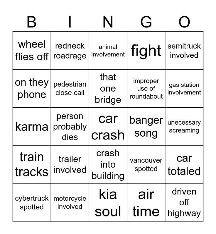 This bingo card has a free space and 24 words: trailer involved, motorcycle involved, that one bridge, cybertruck spotted, semitruck involved, wheel flies off, on they phone, redneck roadrage, banger song, crash into building, improper use of roundabout, karma, vancouver spotted, car totaled, pedestrian close call, air time, unecessary screaming, animal involvement, gas station involvement, person probably dies, driven off highway, train tracks, fight and kia soul.