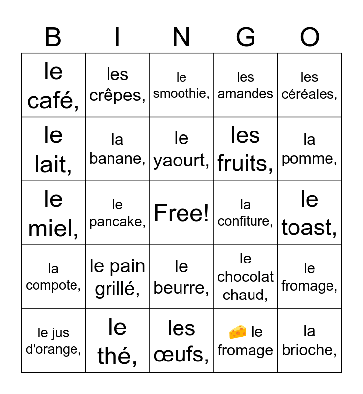 This bingo card has a free space and 25 words: le pain grillé,, les œufs,, le yaourt,, le jus d'orange,, les céréales,, le café,, le lait,, les crêpes,, la confiture,, le beurre,, les fruits,, le miel,, le chocolat chaud,, le fromage,, la banane,, le sirop d'érable,, le toast,, le smoothie,, la pomme,, le pancake,, la brioche,, le thé,, la compote,, les amandes and 🧀 le fromage.