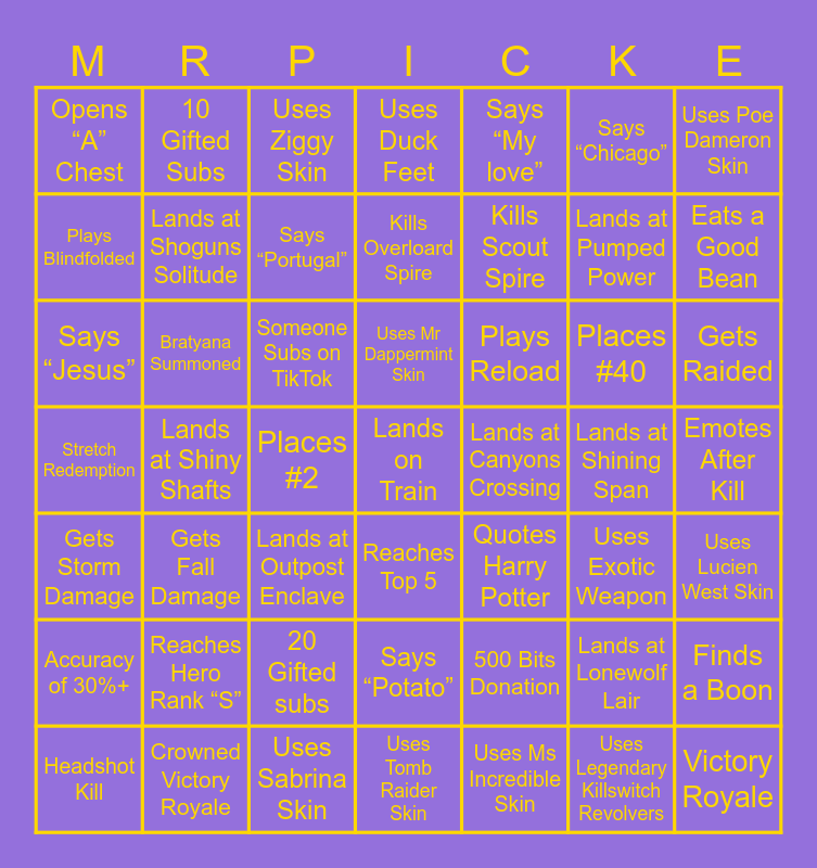 This bingo card has a free space and 129 words: 5 Gifted Subs, 10 Gifted Subs, 20 Gifted subs, 10+ Kills, 5+ Kills, Dies With 0 Kills, Bratyana Summoned, Hannyana Summoned, Victory Royale, Crowned Victory Royale, Lands at Flooded Frogs, Lands at Supernova Academy, Lands at Lonewolf Lair, Lands at Demons Domain, Lands at First Order Base, Lands at Resistance Base, Lands at Shiny Shafts, Lands at Outlaw Oasis, Lands at Crime City, Lands at Foxy Floodgate, Lands at Canyons Crossing, Lands at Shoguns Solitude, Lands at Outpost Enclave, Lands at Kappa Factory, Lands at Utopia City, Lands at Shining Span, Lands at Pumped Power, 500 Bits Donation, 1000 Bits Donation, Someone Tips, Kills Overloard Spire, Kills Scout Spire, Gets Fall Damage, Gets Storm Damage, Dies In Storm, Dies From Fall Damage, Finds a Crown, Gets a Medallion, Uses Legendary Killswitch Revolvers, Eats a Bad Bean, Eats a Good Bean, Technical Difficulties, Galaxy Gift Jumpscare on TikTok, Lupin Gets a Treat, Even Kills, Odd Kills, Dances Hot to Go, Someone Subs on TikTok, Speaks Portuguese, Plays Reload, Plays OG, Gets Raided, Uses Mythic Weapon, Uses Legendary Weapon, Dies at Supernova Academy, Dies Demons Domain, Dies at Crime City, Dies at Flooded Frogs, Dies at Utopia City, Emotes With Someone, Emotes After Kill, Reaches Hero Rank “S”, Goes on Island, Opens Blue Chest, Opens “S” Chest, Opens “A” Chest, Says a Bad Word, Does Super Hero Training Room, Says “Portugal”, Says “Chicago”, Says “Potato”, Says “Jesus”, Quotes Harry Potter, Sings Something, Hides In a Bush, Uses Zipline, Forgets To Show Game, Reaches Top 5, Reaches Top 3, Reaches Top 10, Places #2, Says “My love”, Says “Banned”, Laughs At a Joke From Chat, Plays Blindfolded, Hydrate Redemption, Stretch Redemption, ASMR Redemption, Uses Fish Princess Skin, Uses Finn The Human Skin, Uses Sabrina Skin, Uses Jack Skellington Skin, Uses Mr Dappermint Skin, Uses Ms Incredible Skin, Uses Harley Quinn Skin, Uses Lucien West Skin, Uses Tomb Raider Skin, Uses Ziggy Skin, Uses Poe Dameron Skin, Uses Bunny Penny Skin, Uses Flakey Snowbird Skin, Uses Duck Feet, Places #10, Places #20, Places #30, Places #40, Places #50, Places #60, Places #70, Places #80, Places #90, Uses Tracking Visor, Uses Dash Sprite, Finds a Boon, Uses Myst Gauntlets, Uses Bass Boost, Uses Exotic Weapon, Kills Someone With a Medallion, Kills Someone With a Crown, Plays Hannah Montana Sound, Plays Jet2Holiday Sound, Headshot Kill, Gets 15+ headshots, Accuracy of 30%+, Reaches Sub Goal on Twitch, Reaches Bits Goal on Twitch, Plays Blitz Royale, Blitz Royale Victory and Picke Cries.