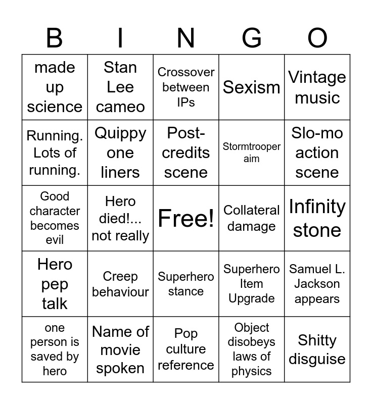 This bingo card has a free space and 24 words: Creep behaviour, Name of movie spoken, Post-credits scene, one person is saved by hero, Vintage music, made up science, Running. Lots of running., Stan Lee cameo, Collateral damage, Superhero stance, Stormtrooper aim, Good character becomes evil, Superhero Item Upgrade, Samuel L. Jackson appears, Quippy one liners, Object disobeys laws of physics, Infinity stone, Crossover between IPs, Slo-mo action scene, Hero died!... not really, Shitty disguise, Hero pep talk, Sexism and Pop culture reference.