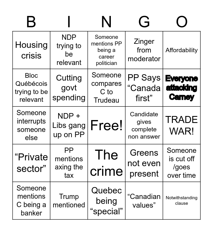 This bingo card has a free space and 24 words: PP mentions axing the tax, Trump mentioned, Someone compares C to Trudeau, Someone mentions C being a banker, Affordability, Housing crisis, Bloc Québécois trying to be relevant, NDP trying to be relevant, Candidate gives complete non answer, The crime, PP Says “Canada first”, Someone interrupts someone else, Greens not even present, Someone is cut off /goes over time, Cutting govt spending, “Canadian values”, TRADE WAR!, Someone mentions PP being a career politician, Everyone attacking Carney, NDP + Libs gang up on PP, Notwithstanding clause, “Private sector”, Zinger from moderator and Quebec being “special”.