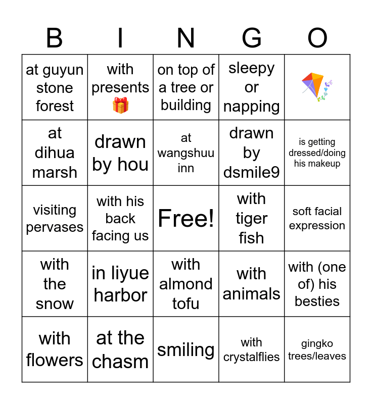 This bingo card has a free space and 24 words: in liyue harbor, at the chasm, at wangshuu inn, with flowers, 🪁, at guyun stone forest, at dihua marsh, with presents 🎁, with tiger fish, with almond tofu, drawn by dsmile9, visiting pervases, with animals, with (one of) his besties, drawn by hou, with crystalflies, soft facial expression, on top of a tree or building, is getting dressed/doing his makeup, with his back facing us, gingko trees/leaves, with the snow, sleepy or napping and smiling.
