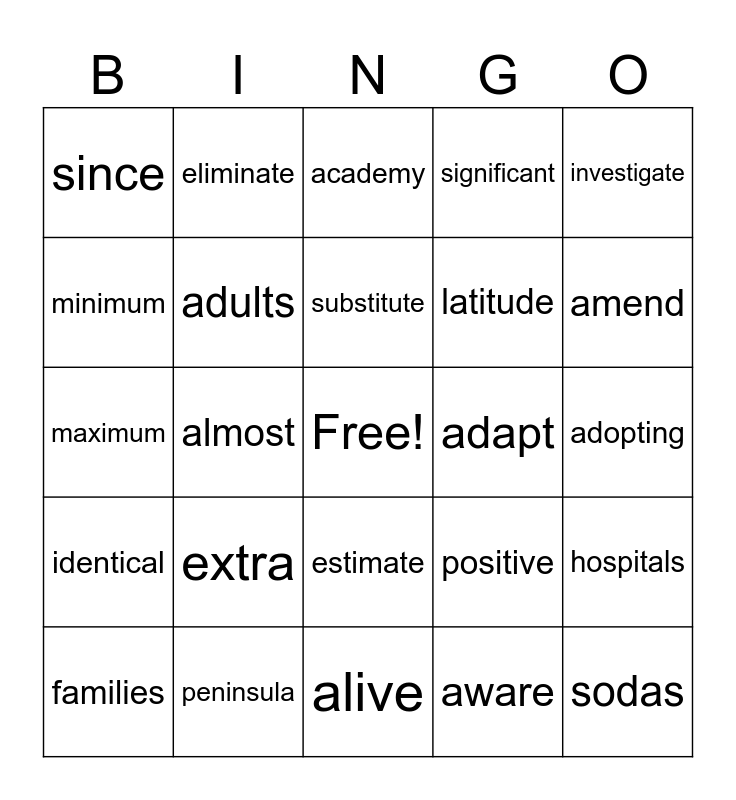 This bingo card has a free space and 29 words: families, soon, almost, early, since, academy, adults, extra, adapt, peninsula, adopting, sodas, alive, aware, amend, continent, estimate, identical, investigate, maximum, positive, identity, latitude, minimum, significant, eliminate, hospitals, substitute and animals.