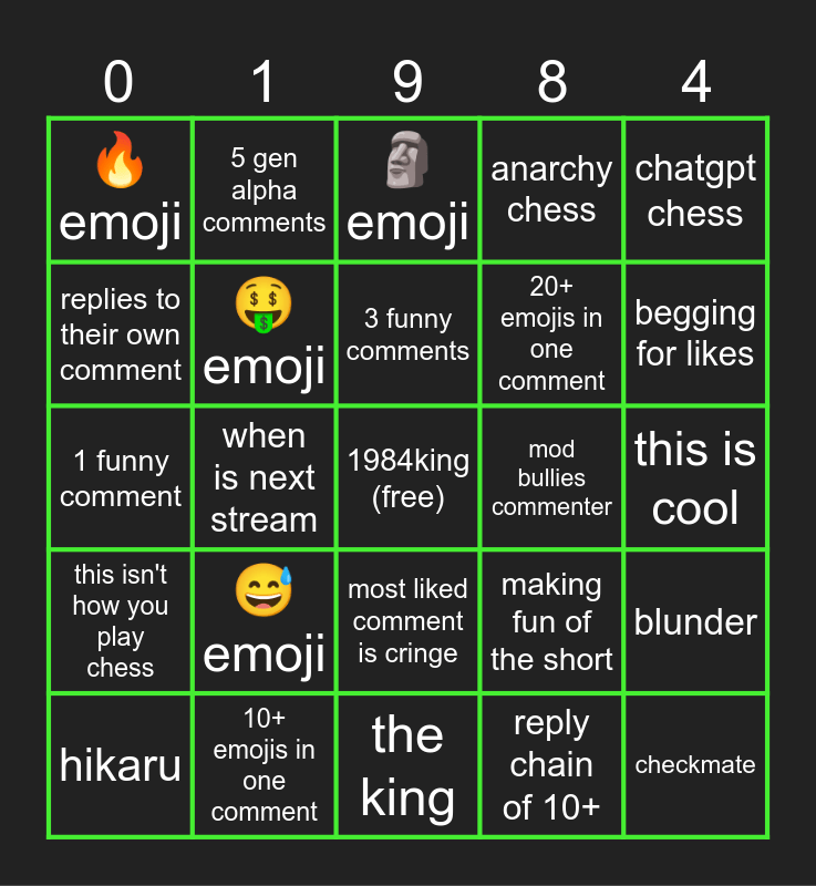 This bingo card has a free space and 114 words: ✅ emoji, green lemon games, chess 2, viper replies, ♟️ emoji, mod replies, anarchy chess, minecraft block battles, the bishop, glazing, mod comments, viper hearts, 💀 emoji, 5+ emojis in one comment, reply chain of 5+, atixai stole your short, most liked comment is cringe, viper comments, bot, hate comment, hikaru, 🗿 emoji, ❌ emoji, gen alpha comment, brainrot comment, this isn't how you play chess, 10+ emojis in one comment, viper is "racist", why does black always lose, 😱 emoji, begging for likes, 3 funny comments, when is next stream, bro is, unreadable comment, any heart emoji, 5 funny comments, 👇 emoji, profile picture is a baby, kids fighting in replies, unrelated comment, chess.com comments, grammar error, viper doesn't heart any comments, comment with parents account, most liked comment roasts viper, reply chain of 10+, replies to their own comment, edit:, gives viper chess short idea, person unsubs, mod bullies commenter, viper excessively hearts, spelling error, 🗣️ emoji, viper comments a non clickable link, 😢 emoji, THE ROOOOOOOK, brilliant move, funny, blunder, someone is stealing your shorts, 😭 emoji, a different move they would've done, grandmaster chess, 10000+ elo, chess if it was invented ___, 🤑 emoji, 1 funny comment, 😂 emoji, this is cool, how i play chess, gothamchess needs to see this, magnus carlsen, chess in ohio, checkmate, 😅 emoji, 🔥 emoji, loop, bolded characters, unfunny comment, 5 gen alpha comments, 5 unfunny comments, making fun of the short, 20+ emojis in one comment, sigma, before gta6, kid profile picture, 10 gen alpha comments, the knight, 10 unfunny comments, most liked comment is hearted, viper replies to most liked comment, chatgpt chess, why does this make sense, 1 spam comment, entire comment in bolded characters, 3 spam comments, wasting food, npc comment, 🙏 emoji, 😜 emoji, 5 spam comments, indian person profile picture, 10 spam comments, 3 unreadable comments, 😎 emoji, the king, 🎉 emoji, ✔️ emoji, bro, 5 unreadable comments, comment section is just slop and viper excessively replies.