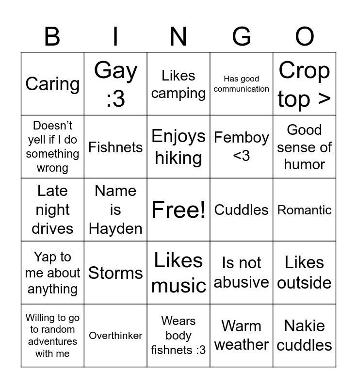 This bingo card has a free space and 24 words: Storms, Overthinker, Enjoys hiking, Willing to go to random adventures with me, Crop top >, Caring, Doesn’t yell if I do something wrong, Gay :3, Cuddles, Likes music, Femboy <3, Late night drives, Is not abusive, Likes outside, Fishnets, Warm weather, Romantic, Likes camping, Good sense of humor, Name is Hayden, Nakie cuddles, Yap to me about anything, Has good communication and Wears body fishnets :3.