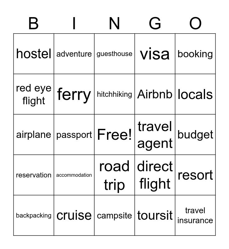 This bingo card has a free space and 41 words: flight, airplane, subway, ferry, cruise, road trip, hitchhiking, itinerary, booking, reservation, passport, visa, travel insurance, budget, travel agent, accommodation, tourist attraction, hostel, hotel, guesthouse, resort, bed and breakfast, campsite, Airbnb, sightseeing, souvenir, toursit, local, locals, landmarks, guided tour, adventure, backpacking, return flight, direct flight, red eye flight, delayed, canceled, layover, stop over and all-inclusive.