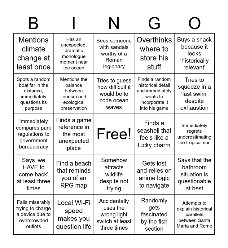 This bingo card has a free space and 24 words: Find a beach that reminds you of an RPG map, Local Wi-Fi speed makes you question life, Tries to guess how difficult it would be to code ocean waves, Fails miserably trying to charge a device due to overcrowded outlets, Buys a snack because it looks ‘historically relevant’, Mentions climate change at least once, Spots a random boat far in the distance, immediately questions its purpose, Has an unexpected, dramatic monologue moment near the ocean, Finds a seashell that feels like a lucky charm, Somehow attracts wildlife despite not trying, Finds a random historical detail and immediately wants to incorporate it into his game, Immediately compares park regulations to government bureaucracy, Gets lost and relies on anime logic to navigate, Says that the bathroom situation is questionable at best, Mentions the balance between tourism and ecological preservation, Randomly gets fascinated by the fish section, Immediately regrets underestimating the tropical sun, Sees someone with sandals worthy of a Roman legionary, Tries to squeeze in a ‘last swim’ despite exhaustion, Finds a game reference in the most unexpected place, Attempts to explain historical parallels between Santa Marta and Rome, Says ‘we HAVE to come back’ at least three times, Overthinks where to store his stuff and Accidentally uses the wrong light switch at least three times.
