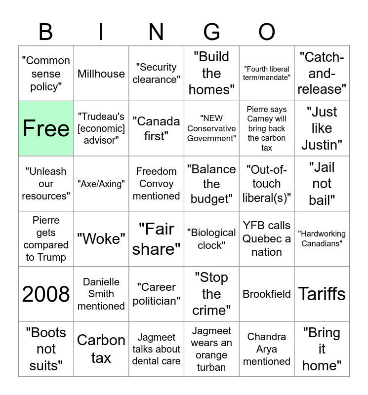 This bingo card has 36 words: Pierre gets compared to Trump, "Woke", Jagmeet talks about dental care, "NEW Conservative Government", "Out-of-touch liberal(s)", "Jail not bail", "Common sense policy", Carbon tax, "Security clearance", "Stop the crime", Pierre says Carney will bring back the carbon tax, "Catch-and-release", 2008, "Axe/Axing", "Canada first", "Build the homes", Brookfield, "Hardworking Canadians", Free, "Trudeau's [economic] advisor", "Fair share", "Biological clock", YFB calls Quebec a nation, Tariffs, "Unleash our resources", Millhouse, Freedom Convoy mentioned, Jagmeet wears an orange turban, "Fourth liberal term/mandate", "Just like Justin", "Boots not suits", Danielle Smith mentioned, "Career politician", "Balance the budget", Chandra Arya mentioned and "Bring it home".