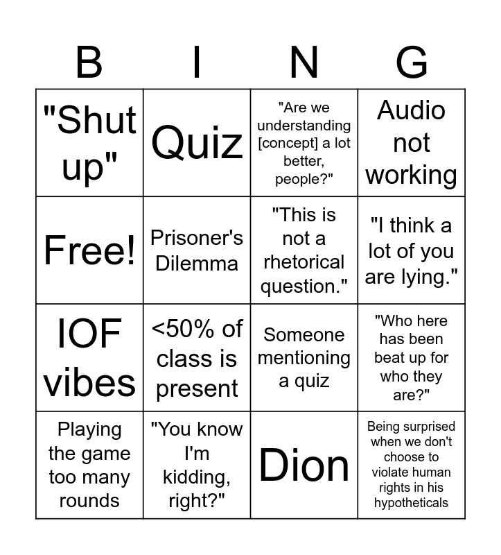 This bingo card has 16 words: "You know I'm kidding, right?", "Who here has been beat up for who they are?", "Are we understanding [concept] a lot better, people?", "Shut up", IOF vibes, Quiz, Someone mentioning a quiz, Dion, Free!, Prisoner's Dilemma, Playing the game too many rounds, Audio not working, <50% of class is present, "I think a lot of you are lying.", "This is not a rhetorical question." and Being surprised when we don't choose to violate human rights in his hypotheticals.