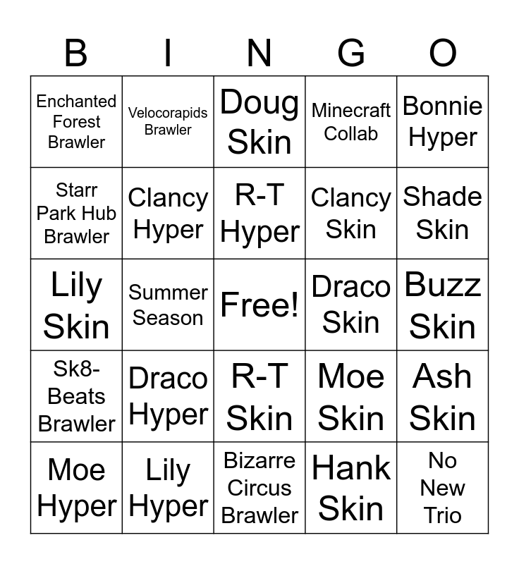 This bingo card has a free space and 24 words: Draco Hyper, Lily Hyper, R-T Hyper, Moe Hyper, Bonnie Hyper, Enchanted Forest Brawler, Starr Park Hub Brawler, Velocorapids Brawler, Draco Skin, R-T Skin, Clancy Skin, Lily Skin, Moe Skin, Ash Skin, Clancy Hyper, Hank Skin, Buzz Skin, Doug Skin, Shade Skin, Summer Season, No New Trio, Sk8-Beats Brawler, Minecraft Collab and Bizarre Circus Brawler.