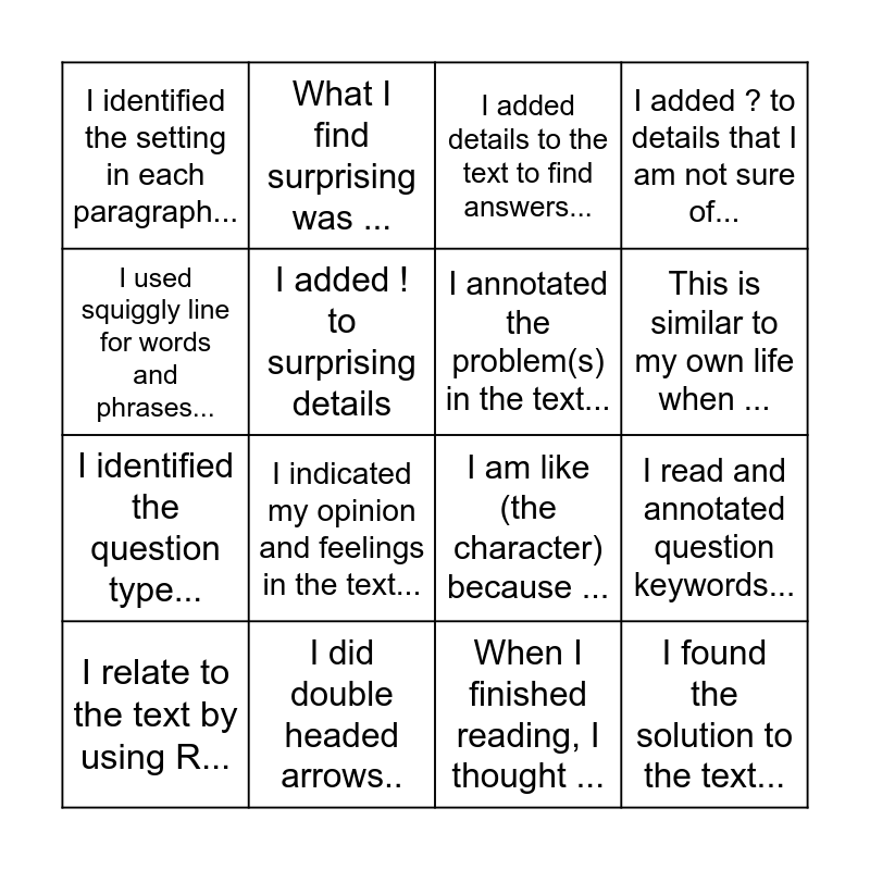 This bingo card has 16 words: I did double headed arrows.., I read and annotated question keywords..., I added details to the text to find answers..., I identified the setting in each paragraph..., I identified the question type..., What I find surprising was ..., I am like (the character) because ..., When I finished reading, I thought ..., I used squiggly line for words and phrases..., I added ! to surprising details, I relate to the text by using R..., I added ? to details that I am not sure of..., I indicated my opinion and feelings in the text..., This is similar to my own life when ..., I annotated the problem(s) in the text... and I found the solution to the text....
