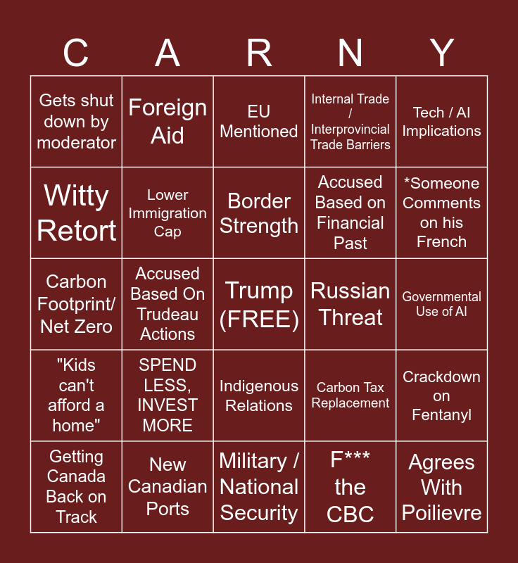 This bingo card has a free space and 24 words: Getting Canada Back on Track, SPEND LESS, INVEST MORE, Border Strength, F*** the CBC, Tech / AI Implications, Gets shut down by moderator, Foreign Aid, EU Mentioned, Russian Threat, Governmental Use of AI, Carbon Footprint/ Net Zero, Lower Immigration Cap, Carbon Tax Replacement, Crackdown on Fentanyl, Witty Retort, New Canadian Ports, Military / National Security, Internal Trade / Interprovincial Trade Barriers, *Someone Comments on his French, "Kids can't afford a home", Accused Based On Trudeau Actions, Indigenous Relations, Accused Based on Financial Past and Agrees With Poilievre.