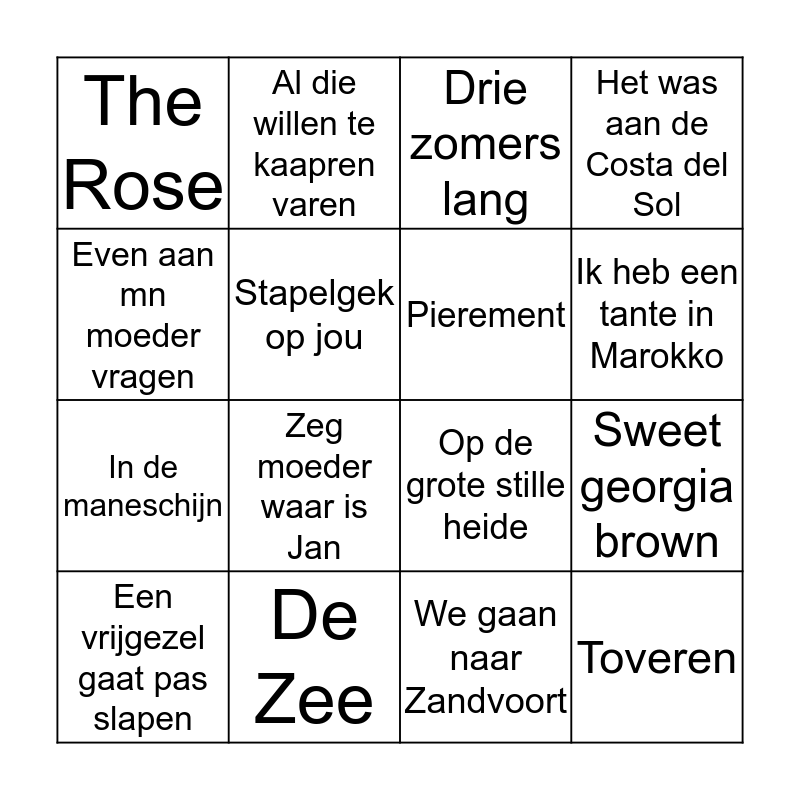 This bingo card has 20 words: Sweet georgia brown, La Bamba, Drie zomers lang, Annie hou jij mn tassie ff vast, Een vrijgezel gaat pas slapen, Even aan mn moeder vragen, De Zee, The Rose, In de maneschijn, Al die willen te kaapren varen, Zeg moeder waar is Jan, Op de grote stille heide, Stapelgek op jou, Toveren, Pierement, De olieman heeft een fordje opgedaan, Ik heb een tante in Marokko, Het was aan de Costa del Sol, We gaan naar Zandvoort and Rum and Coca Cola.