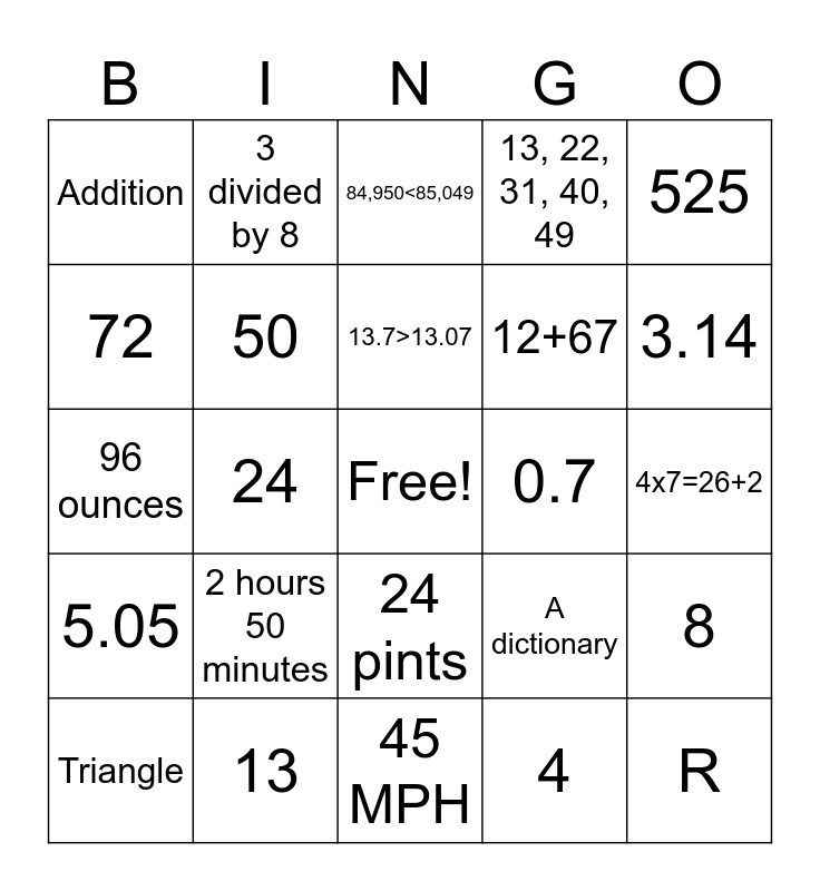 This bingo card has a free space and 32 words: 4, 7/10, 24, 3, 5.05, 50, 525, 8, 3 divided by 8, 9/12, 13.7>13.07, 84,950<85,049, Two and thirty-two hundredths, 7,610,000, 0.7, 7.588, Triangle, 96 ounces, 24 pints, 2 hours 50 minutes, A dictionary, 2,000 millimeters, 4x7=26+2, 13, R, 13, 22, 31, 40, 49, 12+67, 72, Addition, 45 MPH, Circle and 3.14.