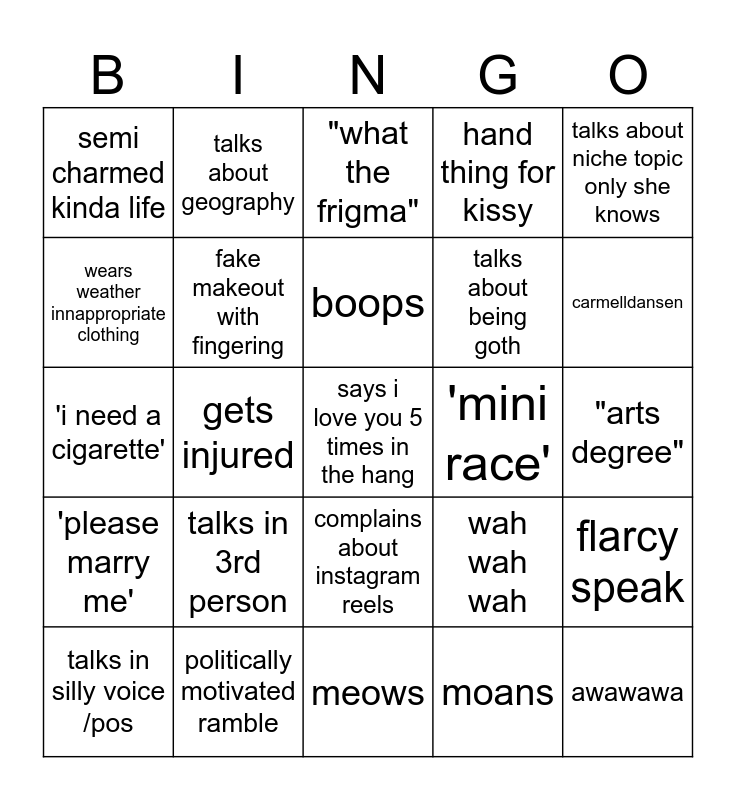 This bingo card has a free space and 24 words: talks in 3rd person, politically motivated ramble, boops, talks in silly voice /pos, talks about niche topic only she knows, semi charmed kinda life, wears weather innappropriate clothing, talks about geography, 'mini race', complains about instagram reels, talks about being goth, 'i need a cigarette', wah wah wah, flarcy speak, fake makeout with fingering, moans, "arts degree", "what the frigma", carmelldansen, gets injured, awawawa, 'please marry me', hand thing for kissy and meows.