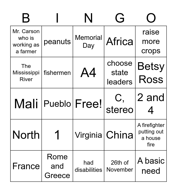 This bingo card has a free space and 41 words: Olympic games, Mali, 2, fishermen, Rome and Greece, Virginia, A4, sunny and warm in each season, raise more crops, North, Pueblo, Africa, A basic need, 2 and 4, C, stereo, 1, Savings, Mr. Carson who is working as a farmer, a capital resource, Memorial Day, A firefighter putting out a house fire, Voting in elections, had disabilities, choose state leaders, lawyer, improving the lives of American farm workers, 26th of November, People elect a small group to make the laws, Betsy Ross, James River, Powhatan, peanuts, France, Used written language, China, The Mississippi River, New York City, corn crops, England, New Orleans and River Boats.