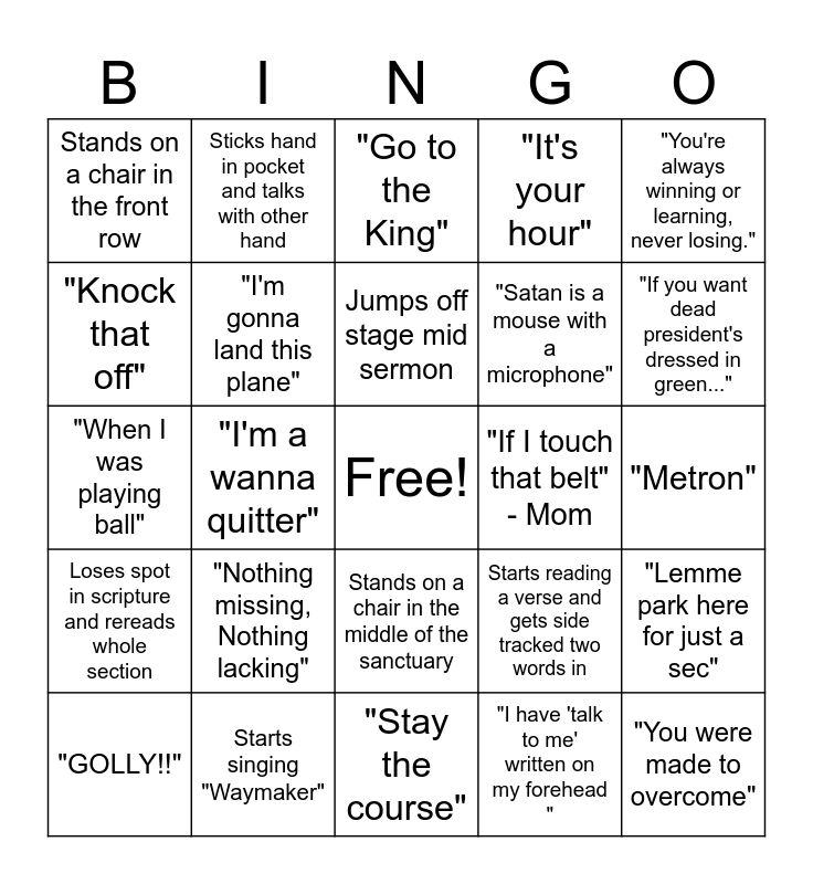 This bingo card has a free space and 24 words: "Nothing missing, Nothing lacking", Starts singing "Waymaker", Jumps off stage mid sermon, "GOLLY!!", "You're always winning or learning, never losing.", Stands on a chair in the front row, "Knock that off", Sticks hand in pocket and talks with other hand, "If I touch that belt" - Mom, Stands on a chair in the middle of the sanctuary, "Satan is a mouse with a microphone", "When I was playing ball", Starts reading a verse and gets side tracked two words in, "Lemme park here for just a sec", "I'm gonna land this plane", "I have 'talk to me' written on my forehead ", "Metron", "Go to the King", "If you want dead president's dressed in green...", "I'm a wanna quitter", "You were made to overcome", Loses spot in scripture and rereads whole section, "It's your hour" and "Stay the course".