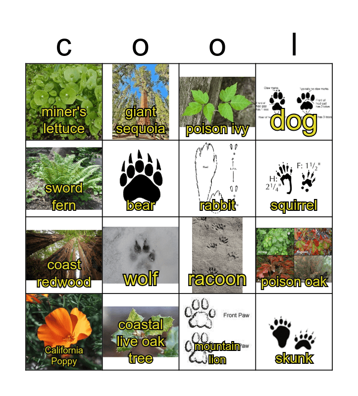This bingo card has 20 images and 20 words: poison oak, poison sumac, poison ivy, Douglas Fir, California Poppy, sword fern, coastal live oak tree, miner's lettuce, coast redwood, giant sequoia, wolf, racoon, bear, skunk, rabbit, deer, squirrel, dog, mountain lion and mouse.