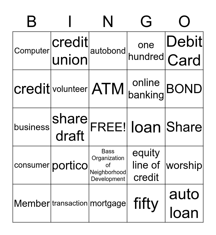 This bingo card has a free space and 24 words: portico, transaction, ATM, Member, Debit Card, Computer, credit, credit union, loan, Bass Organization of Neighborhood Development, online banking, business, equity line of credit, worship, volunteer, fifty, Share, autobond, BOND, share draft, auto loan, consumer, one hundred and mortgage.