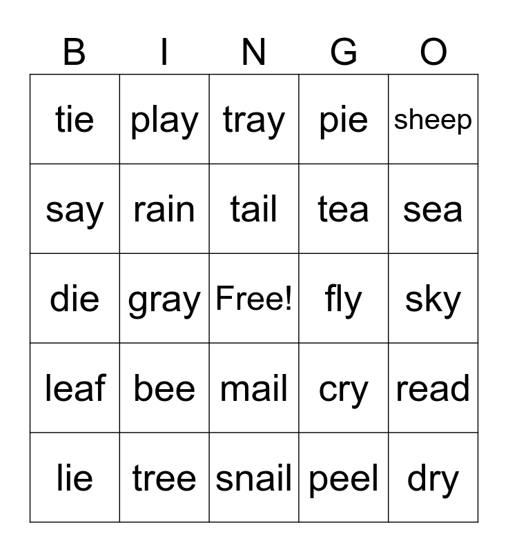 This bingo card has a free space and 24 words: bee, tree, tail, lie, sheep, tie, say, play, fly, mail, tea, die, cry, read, rain, peel, sky, tray, sea, gray, dry, leaf, pie and snail.