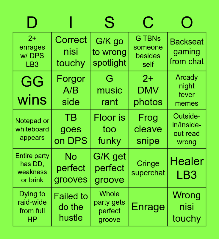 This bingo card has a free space and 29 words: Dying to raid-wide from full HP, Traffic accident in riding the wave, TB goes on DPS, Shared spotlight, 2+ enrages w/ DPS LB3, G/K go to wrong spotlight, Forgor A/B side, No perfect grooves, Frog cleave snipe, Failed to do the hustle, Outside-in/Inside-out read wrong, Wrong nisi touchy, Whole party gets perfect groove, Enrage, Arcady night fever memes, Stream starts earlier/later than expected (+/- 20 mins), G/K get perfect groove, Entire party has DD, weakness or brink, Backseat gaming from chat, Notepad or whiteboard appears, Cringe superchat, Boss wins, 2+ DMV photos, GG wins, G TBNs someone besides self, Correct nisi touchy, Healer LB3, G music rant and Correct spotlight.