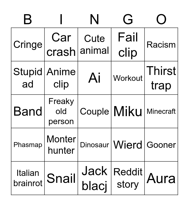 This bingo card has a free space and 24 words: Monter hunter, Snail, Ai, Italian brainrot, Racism, Cringe, Stupid ad, Car crash, Miku, Dinosaur, Workout, Band, Wierd, Gooner, Anime clip, Reddit story, Minecraft, Cute animal, Thirst trap, Freaky old person, Aura, Phasmap, Fail clip and Jack blacj.