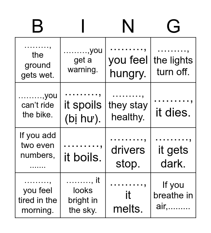 This bingo card has 17 words: ………, it melts., ………, you feel tired in the morning., ………, you feel hungry., ………, the ground gets wet., ………, it boils., ………, the lights turn off., ………, it gets dark., ………, they stay healthy., ………, it dies., ………, it spoils (bị hư)., ………, it looks bright in the sky., ………, drivers stop., ………,you can’t ride the bike., ………,you get a warning., If you add two even numbers, ......., If your heart beat, ........ and If you breathe in air,..........
