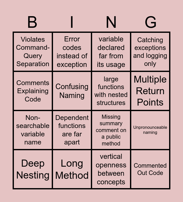 Code Smell Bingo!! | Code Smell Bingo!! | Code Smell Bingo!! | Code Smell Bingo!! | Reading others code