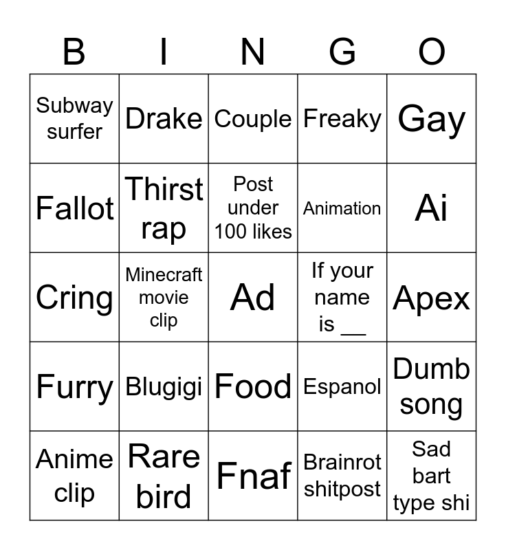 This bingo card has a free space and 24 words: Blugigi, Rare bird, Post under 100 likes, Anime clip, Gay, Subway surfer, Fallot, Drake, If your name is __, Food, Animation, Cring, Espanol, Dumb song, Thirst rap, Brainrot shitpost, Apex, Couple, Ai, Minecraft movie clip, Sad bart type shi, Furry, Freaky and Fnaf.