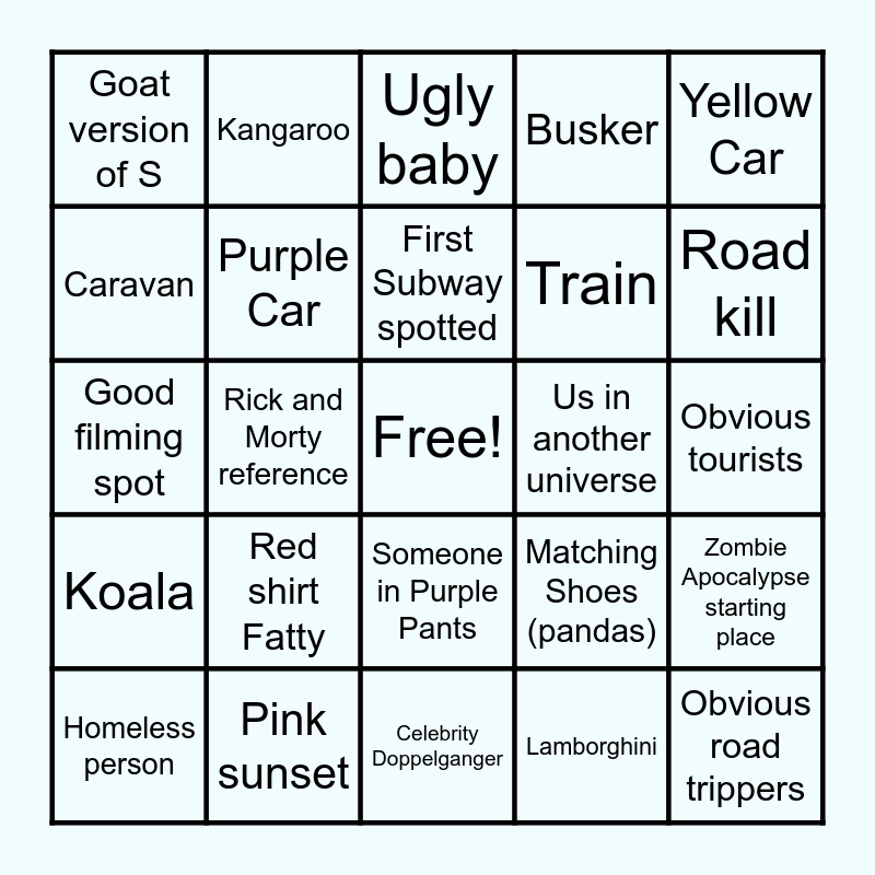 This bingo card has a free space and 25 words: Red shirt Fatty, Celebrity Doppelganger, First Subway spotted, Homeless person, Yellow Car, Goat version of S, Caravan, Kangaroo, Us in another universe, Someone in Purple Pants, Train, Good filming spot, Matching Shoes (pandas), Zombie Apocalypse starting place, Purple Car, Classic K fit, Obvious tourists, Ugly baby, Road kill, Rick and Morty reference, Obvious road trippers, Pink sunset, Koala, Busker and Lamborghini.