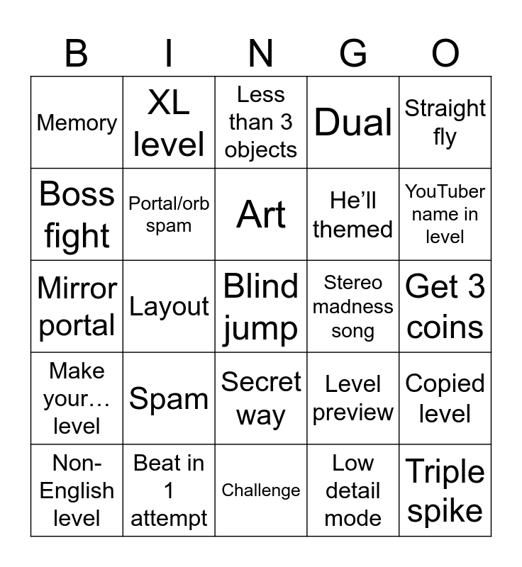 This bingo card has 25 words: Spam, Challenge, Art, Non-English level, Straight fly, Memory, Boss fight, XL level, Stereo madness song, Secret way, He’ll themed, Mirror portal, Level preview, Copied level, Portal/orb spam, Triple spike, Get 3 coins, Less than 3 objects, YouTuber name in level, Layout, Blind jump, Beat in 1 attempt, Make your…level, Dual and Low detail mode.
