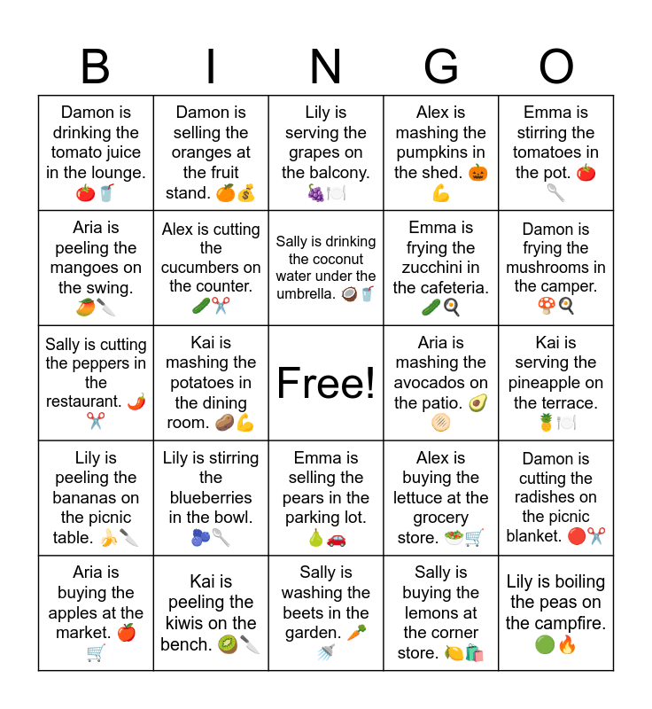 This bingo card has a free space and 33 words: Aria is washing the carrots in the kitchen. π₯π§Ό, Damon is boiling the broccoli on the stove. π₯¦π₯, Kai is mashing the potatoes in the dining room. π₯πͺ, Sally is frying the onions in the food truck. π§ π³, Lily is peeling the bananas on the picnic table. ππͺ, Alex is cutting the cucumbers on the counter. π₯βοΈ, Emma is stirring the tomatoes in the pot. π π₯, Aria is buying the apples at the market. ππ, Damon is selling the oranges at the fruit stand. ππ°, Kai is eating the watermelon on the porch. ππ, Sally is drinking the coconut water under the umbrella. π₯₯π₯€, Lily is serving the grapes on the balcony. ππ½οΈ, Alex is washing the spinach in the sink. π₯¬π°, Emma is boiling the corn in the cafeteria. π½π₯, Aria is mashing the avocados on the patio. π₯π«, Damon is frying the mushrooms in the camper. ππ³, Kai is peeling the kiwis on the bench. π₯πͺ, Sally is cutting the peppers in the restaurant. πΆοΈβοΈ, Lily is stirring the blueberries in the bowl. π«π₯, Alex is buying the lettuce at the grocery store. π₯π, Emma is selling the pears in the parking lot. ππ, Aria is eating the strawberries on the rooftop. ππ, Damon is drinking the tomato juice in the lounge. π π₯€, Kai is serving the pineapple on the terrace. ππ½οΈ, Sally is washing the beets in the garden. π₯πΏ, Lily is boiling the peas on the campfire. π’π₯, Alex is mashing the pumpkins in the shed. ππͺ, Emma is frying the zucchini in the cafeteria. π₯π³, Aria is peeling the mangoes on the swing. π₯πͺ, Damon is cutting the radishes on the picnic blanket. π΄βοΈ, Kai is stirring the cherries in the bowl. ππ₯, Sally is buying the lemons at the corner store. πποΈ and Lily is selling the limes under the tent. ππ΅.