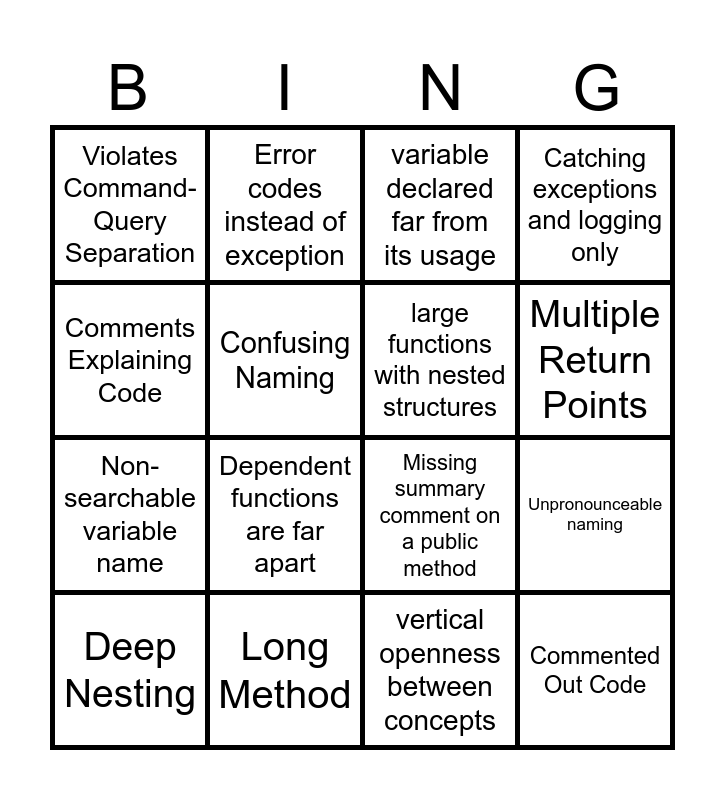 This bingo card has 24 words: Too Many Responsibilities, Switch Statement Abuse, Multiple Return Points, Code Duplication, Comments Explaining Code, Violates Command-Query Separation, Confusing Naming, Error codes instead of exception, Long Method, Too many arguments (>3), Non-searchable variable name, Missing summary comment on a public method, Requires horizontal scrolling, Use of pun, large functions with nested structures, missing legal comments, vertical openness between concepts, variable declared far from its usage, Dependent functions are far apart, Unpronounceable naming, Deep Nesting, Commented Out Code, Catching exceptions and logging only and Message Chains – a.b().c().d() trainwreck.