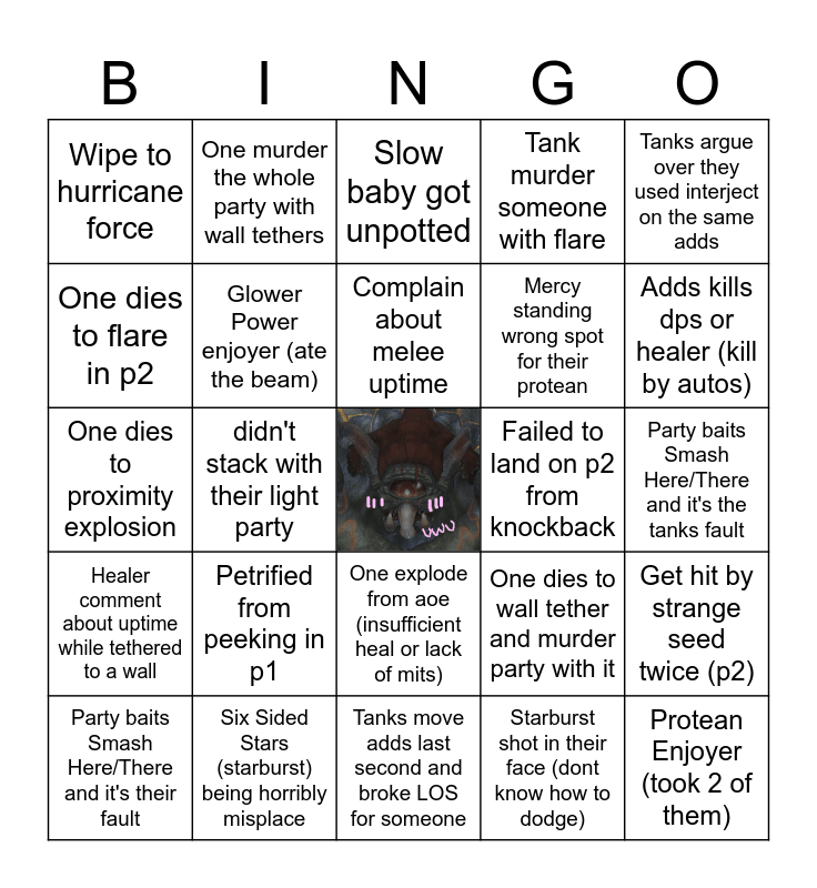 This bingo card has a free space and 24 words: Party baits Smash Here/There and it's their fault, Petrified from peeking in p1, Complain about melee uptime, Starburst shot in their face (dont know how to dodge), Tanks argue over they used interject on the same adds, Wipe to hurricane force, One murder the whole party with wall tethers, Slow baby got unpotted, Failed to land on p2 from knockback, Party baits Smash Here/There and it's the tanks fault, One dies to proximity explosion, Glower Power enjoyer (ate the beam), One dies to wall tether and murder party with it, Get hit by strange seed twice (p2), One dies to flare in p2, Six Sided Stars (starburst) being horribly misplace, Tanks move adds last second and broke LOS for someone, Tank murder someone with flare, Adds kills dps or healer (kill by autos), Healer comment about uptime while tethered to a wall, didn't stack with their light party, One explode from aoe (insufficient heal or lack of mits), Mercy standing wrong spot for their protean and Protean Enjoyer (took 2 of them).
