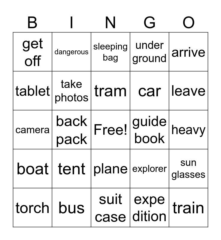 This bingo card has a free space and 24 words: tent, bus, tram, torch, arrive, get off, tablet, dangerous, guide book, plane, car, camera, explorer, sun glasses, take photos, expe dition, heavy, sleeping bag, leave, back pack, train, boat, under ground and suit case.