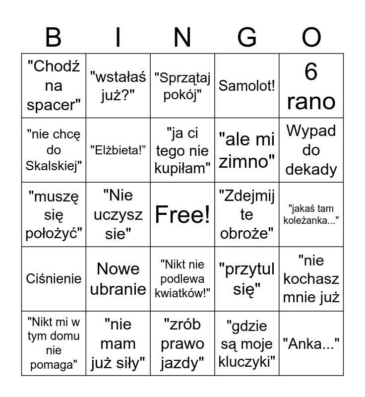 This bingo card has a free space and 24 words: "Nikt mi w tym domu nie pomaga", Nowe ubranie, "ja ci tego nie kupiłam", "gdzie są moje kluczyki", 6 rano, "Chodź na spacer", "wstałaś już?", "Sprzątaj pokój", "Zdejmij te obroże", "jakaś tam koleżanka...", "muszę się położyć", "Elżbieta!”, "przytul się", "nie kochasz mnie już, "nie chcę do Skalskiej", "nie mam już siły", "zrób prawo jazdy", Samolot!, Wypad do dekady, Ciśnienie, "Nie uczysz sie", "Nikt nie podlewa kwiatków!", "ale mi zimno" and "Anka...".