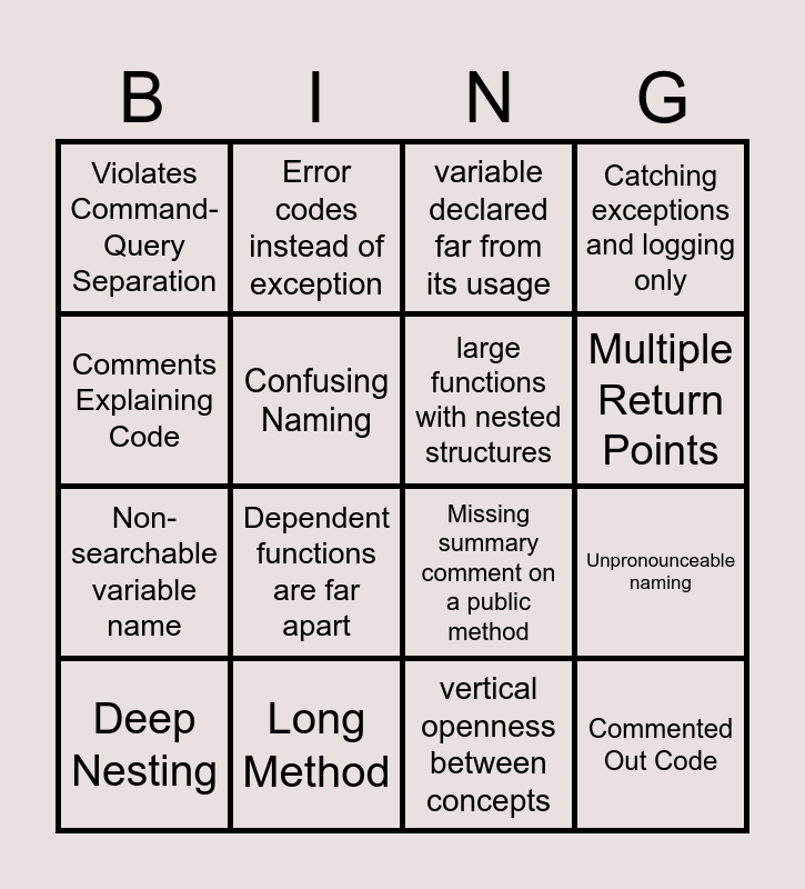 Spot the Smell Bingo!!! | Code Smell Bingo!! | Code Smell Bingo!! | Code Smell Bingo!! | Reading others code