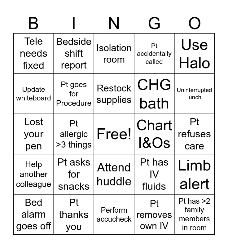 This bingo card has a free space and 34 words: Full bed change, Pt removes own IV, ER admit, Pt asks for pain meds, Help another colleague, Pt goes for Procedure, Use Halo, Bed alarm goes off, Bedside shift report, Collect specimen, Restock supplies, Isolation room, Pt NPO, Bed bath, Chart I&Os, Uninterrupted lunch, Pt thanks you, Lost your pen, Pt asks for snacks, Pt has IV fluids, Attend huddle, Same Pt >1 day, Tele needs fixed, Pt refuses care, Perform accucheck, Pt has >2 family members in room, Pt accidentally called, Dressing change, CHG bath, Update whiteboard, IV pump downstream occlusion, Pt allergic >3 things, Limb alert and Pt older than 90.