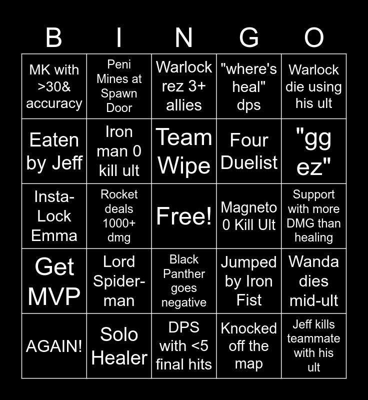 This bingo card has a free space and 24 words: Lord Spider-man, Solo Healer, Team Wipe, AGAIN!, Warlock die using his ult, MK with >30& accuracy, Eaten by Jeff, Peni Mines at Spawn Door, Magneto 0 Kill Ult, Black Panther goes negative, Four Duelist, Insta-Lock Emma, Jumped by Iron Fist, Wanda dies mid-ult, Iron man 0 kill ult, Knocked off the map, Support with more DMG than healing, Warlock rez 3+ allies, "gg ez", Rocket deals 1000+ dmg, Jeff kills teammate with his ult, Get MVP, "where's heal" dps and DPS with <5 final hits.