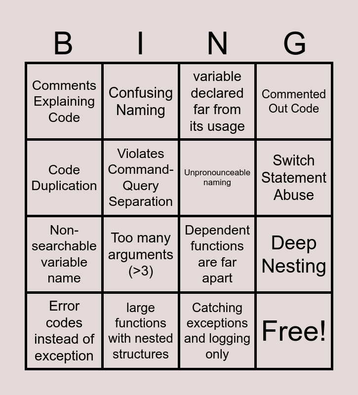 Code Smell Bingo!! | Code Smell Bingo!! | Spot the Smell Bingo!!! | Code Smell Bingo!! | Reading others code