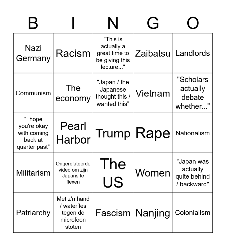 This bingo card has a free space and 24 words: Ongerelateerde video om zijn Japans te flexen, Met z'n hand / waterfles tegen de microfoon stoten, "Japan / the Japanese thought this / wanted this", Patriarchy, Landlords, Nazi Germany, Communism, Racism, Rape, The US, Vietnam, "I hope you're okay with coming back at quarter past", Women, "Japan was actually quite behind / backward", The economy, Nanjing, Nationalism, "This is actually a great time to be giving this lecture...", "Scholars actually debate whether...", Pearl Harbor, Colonialism, Militarism, Zaibatsu and Fascism.