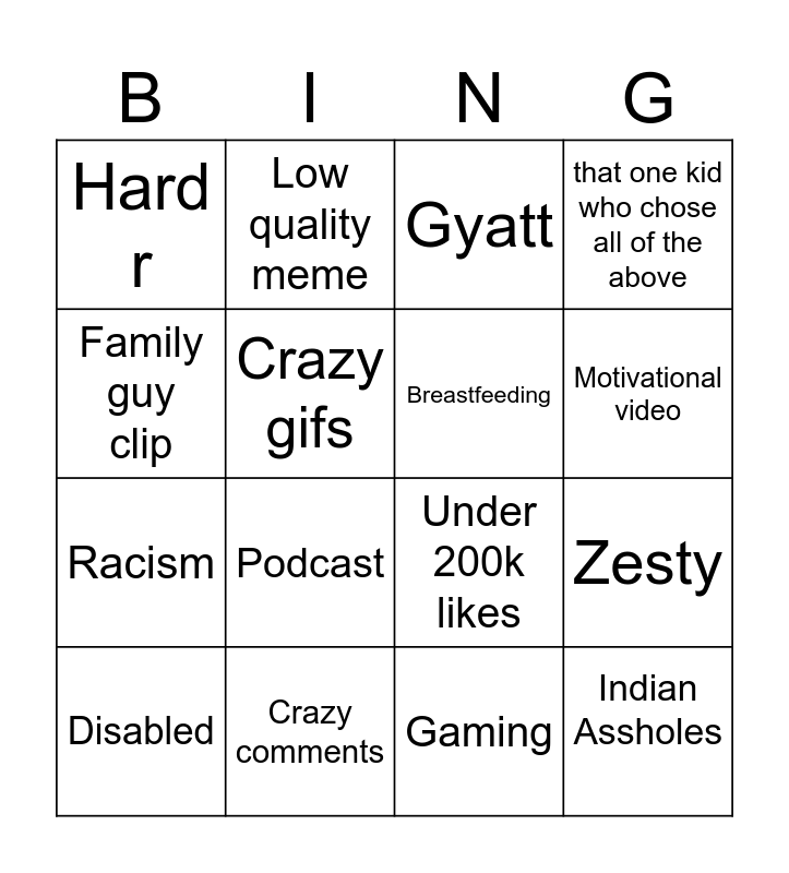 This bingo card has 16 words: Crazy comments, Zesty, Gyatt, Hard r, Racism, Low quality meme, Under 200k likes, Gaming, Family guy clip, Crazy gifs, Disabled, that one kid who chose all of the above, Podcast, Motivational video, Breastfeeding and Indian Assholes.