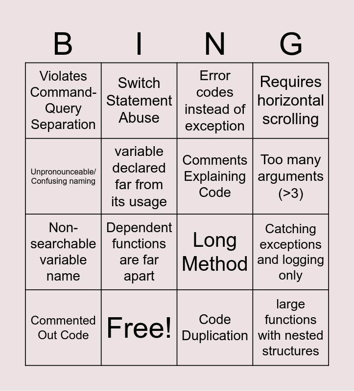 Code Smell Bingo!! | Code Smell Bingo!! | Code Smell Bingo!! | Spot the Smell Bingo!!! | Reading others code