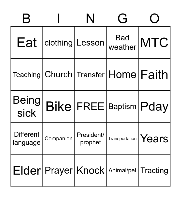 This bingo card has a free space and 29 words: Elder, Sister, Bike, Scriptures, Eat, Lesson, Church, Companion, Baptism, Prayer, Pday, Tracting, Knock, Animal/pet, Faith, Mission, President/ prophet, Different language, MTC, Being sick, Transportation, Fasting, Home, Teaching, Bad weather, clothing, Years, Transfer and Investigator/ Friend.