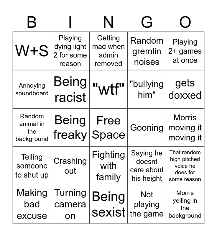 This bingo card has a free space and 24 words: Crashing out, Turning camera on, "wtf", Making bad excuse, Playing 2+ games at once, W+S, Annoying soundboard, Playing dying light 2 for some reason, Gooning, Fighting with family, "bullying him", Random animal in the background, Saying he doesnt care about his height, That random high pitched voice he does for some reason, Being racist, Not playing the game, Morris moving it moving it, Getting mad when admin removed, gets doxxed, Being freaky, Morris yelling in the background, Telling someone to shut up, Random gremlin noises and Being sexist.